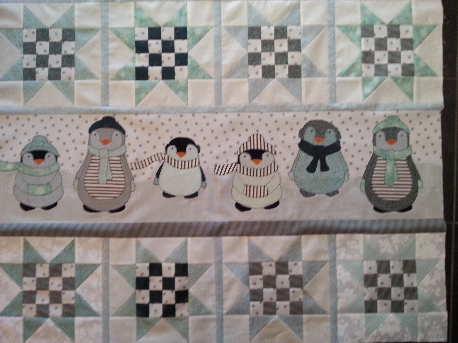 Her er teppet mitt vokst ganske betraktelig. Vanligvis iker jeg å sette sammen stoff selv samt at mønsteret gjerne bli gjort litt om på. Men ikke denne gangen. Jeg elsker fargene og mønsteret. Dette er et Northern Quilt design. Sjekk ut siden deres. Veldig mye fint . Jeg har linket til siden med pingvinmønsteret deres.
